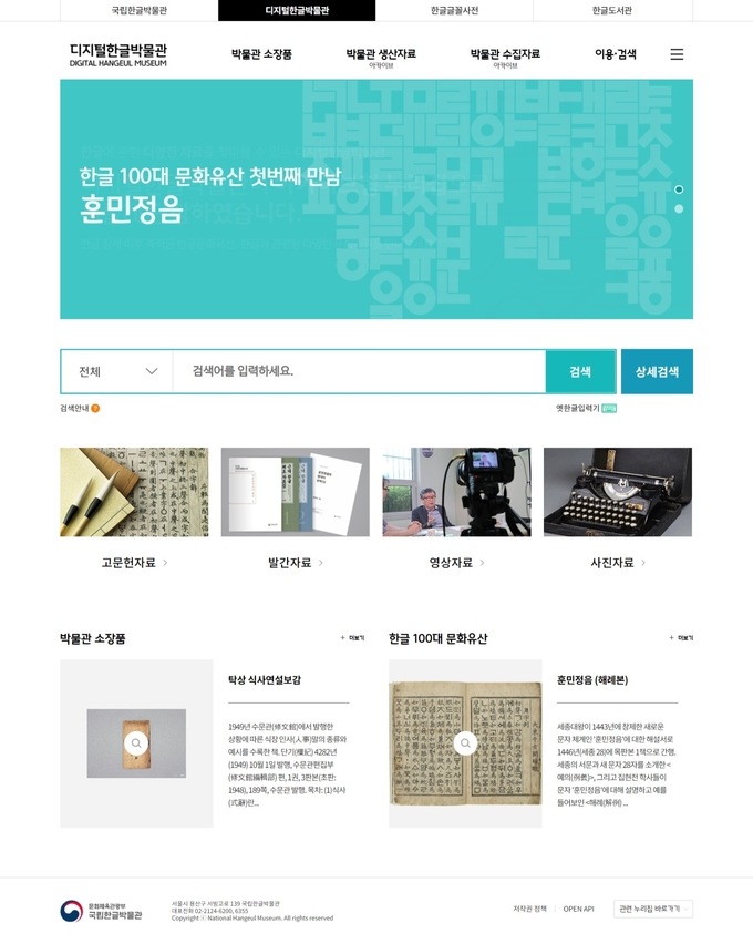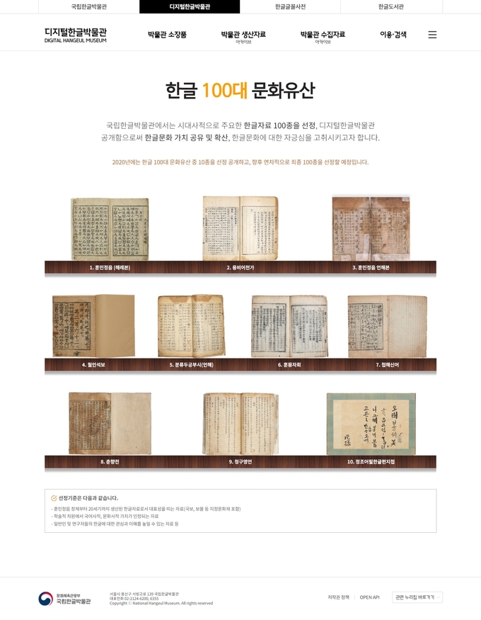 아울러, 전국박물관 소장품검색 사이트인 이뮤지엄에서만 검색할 수 있었던 한글박물관 소장품 15,800여 건을 검색할 수 있게 하였으며, 한글문화의 가치 공유 및 확산을 위하여 국립한글박물관이 선정한 <한글 100대 문화유산> 10종도 함께 공개한다.