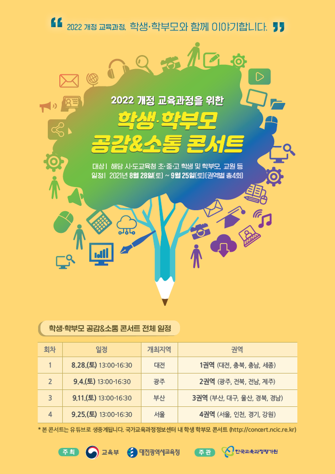 교육부와 한국교육과정평가원은 17개 시도교육청과 함께 ‘2022 개정 교육과정 학생‧학부모 콘서트’를 8월 28일(토)부터 9월 25일(토)까지 전국 4개 권역별로 나누어 개최한다.