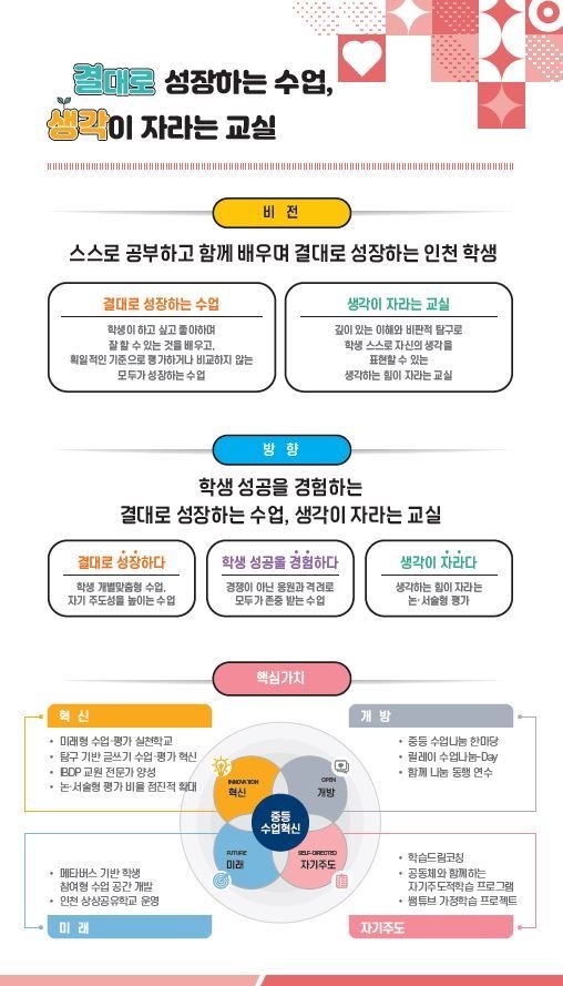 도성훈 교육감은 “중등 수업 혁신 계획을 통해 우리 인천교육이 코로나19 이전으로 단순히 돌아가는 것이 아니라, 미래사회에 필요한 학생들의 역량을 키워주는 수업과 평가 혁신으로 도약하길 바란다”고 말했다.
