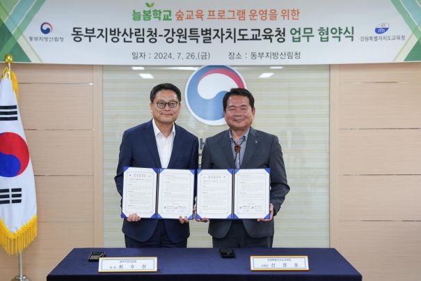 (아름다운교육신문) 강원특별자치도교육청은 26일 오후 2시 동부지방산림청에서 늘봄학교 숲교육 프로그램 운영을 위한 업무협약을 체결했다.