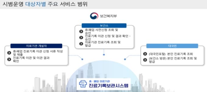 이번 시범사업에서는 서울 마포구 보건소 등 12개 참여 보건소를 중심으로, 자동 이관기능이 개발된 2개 상용 전자의무기록 시스템을 사용하는 의료기관이 휴업 또는 폐업 시 진료기록을 전자적으로 이관하는 절차 등을 시범적으로 운영함으로써 휴폐업 진료기록 이관 업무절차 등을 구체화하고, 시스템 본 가동 전 개선사항을 도출할 계획이다.