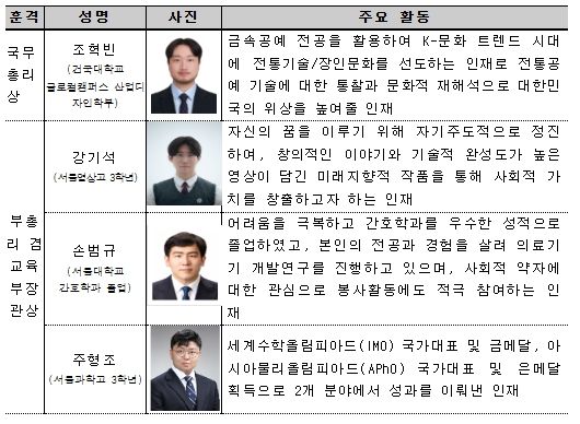 ‘2024 대한민국 인재상’ 수상자로 지역심사와 중앙심사를 거쳐 전국의 우수 인재 100명(고교 50명, 대학·일반 50명)이 최종 선발되었으며, 이 중 1명은 국무총리상(상금 3백만 원)을, 99명은 부총리 겸 교육부 장관상(상금 2백만 원)을 수상한다.