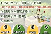 (아름다운교육신문) 대구두류도서관은 10월 18일부터 31일까지 어린이실에서 선착순 40가족을 대상으로 책과 소풍 물품을 함께 대여하면 머리띠와 퍼즐을 증정하는‘우리가족 가을 책소풍’행사를 실시한다. 참여를 원하는 가족은 어린이실에 방문하여 도서관 회원증을 제시하고 책과 돗자리, 간이의자, 미니테이블, 독후활동지, 보드게임 등 소풍에 필요한 물품을 대여하고 당일 오후 5시까지 반납하면 된다. 기타 자세한 내용은 도서관 누리집 또는 어린이실로 문의하면 된다.