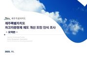 (아름다운교육신문) 제주특별자치도가 올해 3월 개선한 차고지증명제에 대해 도민들은 긍정적으로 평가하면서도 공영주차장 확충 등 지속적인 인프라 확대를 요구하는 것으로 나타났다. 제주도는 차고지증명제 개정 시행에 따른 도민 인식과 체감도를 파악하고자 지난 8월 27일부터 10월 25일까지 모바일 및 대면조사를 진행했다. 차고지증명 신청 경험이 2회 이상인 1,148명을 표본으로 삼았다. 설문지는 인구통계와 제도 개선 인식조사의 2개 분야 총 31개 문항으로 구성됐다. ‘제도 인식 및 수용성’, ‘주차여건 및 불법주정차 변화’, ‘세부 개선사항에 대한 인식’, ‘제도 전반 평가 및 향후 방향’ 등 4가지 항목을 담았다. 응답자는 남성 54.9%, 여성 45.1%였으며 연령대별로는 30대가 28.7%로 가장 많았다. 제주시 동지역 거주자가 42.2%, 단독주택 거주자가 50%로 각각 가장 높은 비율을 보였다. 조사 결과 전체 평균은 3.61점(5점 만점)으로 집계됐다. 항목별로는 ‘세부 개선사항에 대한 인식’이 3.87점으로 가장 높았고, ‘제도 인식 및 수용성’ 3.79점, ‘제도 전반 평가 및 향후
