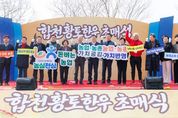 (아름다운교육신문) 합천군은 합천축협과 함께 지역 대표 브랜드인 합천황토한우의 우수성을 알리고, 지역 한우산업 경쟁력 강화를 기원하고자 ‘합천황토한우 초매식’을 개최했다. 이번 초매식은 1월 29일 합천축협 스마트한우경매시장에서 열렸으며, 김윤철 합천군수, 정봉훈 합천군의장과 합천군의회 의원, 김용욱 합천축협 조합장, 김종배 전국한우협회합천군지부장과 한우 사육농가 등 약 100여 명이 참석해 행사의 의미를 더했다. 합천황토한우는 1999년 특허청 브랜드로 등록되어 합천군과 합천축협이 함께 운영하고 있는 한우 브랜드로, 16개월 이상 자체 사양관리 프로그램에 따라 합천축협이 생산하는 황토가 첨가된 전용 사료를 급여한 한우만을 출하하고 있으며, 부드러운 육질과 뛰어난 향미가 일품이다. 이번 초매식 개최지인 합천축협 스마트한우경매시장은 2021년 실시간 스마트 경매시스템을 도입하여 연간 9천두 이상의 한우를 경매하는 대규모 경매시장으로 매주 첫째주 목요일에는 큰소 경매를, 둘째 넷째주 목요일에는 송아지 경매를 실시하고 있으며, 이날 초매식에는 송아지 274마리가 출품되며 성황리에 진행됐다. 행사는 송아지