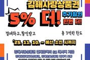 (아름다운교육신문) 김해시는 오는 10일부터 김해사랑상품권 결제금액의 5%를 김해사랑상품권으로 환급(캐시백)하는 추가 할인 행사를 추진한다고 6일 밝혔다. 지역사랑상품권 국비지원 발행분 판매실적 우수 지자체로 선정돼 추가 인센티브를 교부받아 이뤄지는 행사이다. 추가 인센티브는 1차 정부 추경예산 지원을 받아 발행한 지역사랑상품권 8월 말 기준 판매실적 평가 결과에 따른 것으로, 총 300억 원 규모로 전국 33개 지자체가 선정됐으며 경남에서 김해시가 유일하다. 추가 할인은 김해사랑상품권뿐 아니라 김해공공배달앱상품권, 김해온몰상품권 결제금액에도 동일하게 적용된다. 이번 행사는 3억 원 규모로 예산 소진 전까지 진행되며 환급은 추가할인 종료 이후인 12월 중 일괄 지급 예정이다. 시는 앞서 지난 10월 29일부터 9일까지 ‘코리아그랜드페스티벌’과 연계해 김해사랑상품권 추가환급 행사를 진행하고 있으며 이번 추가할인은 그 연장선에서 지역 소상공인 매출 증대와 시민 소비 촉진에 큰 도움이 될 것으로 기대된다. 시 관계자는 “이번 추가할인은 전국적으로 우수한 판매실적을 인정받아 확보