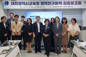 (아름다운교육신문) 대전시교육청 대전교육과학연구원 대전교육정책연구소는 9월 26일, 29일, 10월 1일에 걸쳐 대전교육과학연구원 정책연구협의회실에서 대전광역시교육청 정책연구용역(위탁연구) 최종보고회를 개최했다. 최종보고회의 목적은 위탁연구과제의 추진 상황을 총체적으로 점검하고 교육공동체 간 소통을 통해 정책연구의 실효성과 효과성을 높이는 데 있다. 이번 최종보고회는 교육정책 연구의 외부 전문가로 대학교수와 대전교육정책연구 지원단이 심의위원으로 참여하여 사전 서면심의와 당일 대면심의로 진행됐으며, 대면 심의는 연구책임자의 연구 최종결과 발표 후 심의위원과 연구협력관 의견 및 질의응답 순으로 이어졌다. 추후 심의 의견이 반영된 완료보고서를 발간하여 교육가족을 대상으로 연구결과의 공유 및 정책입안 논의의 장으로 연차보고회(11월 28일)를 개최할 예정이다. 최종보고회 심의대상 연구과제는 ‘대전교육발전특구 운영 성과 분석 및 발전 방안 연구’, ‘대전광역시 IB 프로그램 도입 및 현장 적용방안 연구’, ‘대전유보통합 운영 방안 정책연구’, ‘대전생태전환교육센터(가칭) 설립을 통한 생태전환교육 활성화 방안 연구’, ‘대전광역시 고